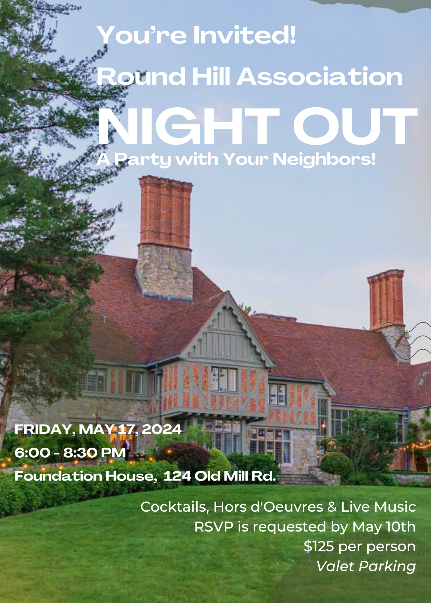 Tickets are now on sale for our second annual Night Out celebration of all things Round Hill and backcountry Greenwich. Meet new neighbors and connect with old ones at Foundation House. Live music, great food and drinks. Tickets on sale now. Get them while you can. Click Here to purchase tickets.Read More